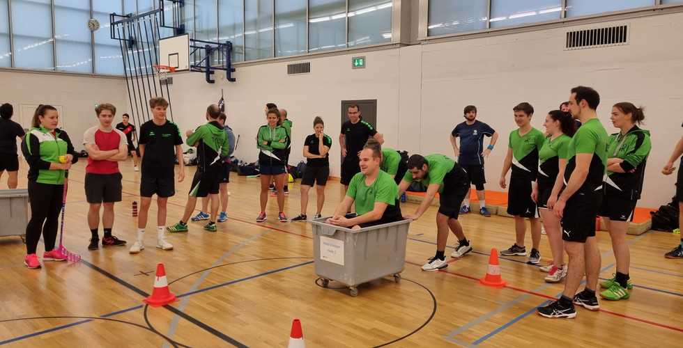 Nach einer kleinen Einweihung in die Regeln und der Aufteilung der Teams in Gruppen A bis D, wurde um zirka 9:45 Uhr das Turnier für eröffnet erklärt. Auf dem Plan: 3 Disziplinen. In den beiden äusseren Teilen der Halle wurden jeweils Volleyball und Unihockey gespielt, während in der Mitte der Halle ein kleines Plauschspiel ausgefochten wurde. Dieses Bestand am Morgen aus einem «Wägeli-Curling», wobei die Teamkollegen sich gegenseitig mit einem Materialwagen so auf ein Curlingfeld schieben mussten, dass der Wagen in dem Kreis mit der möglichst höchsten Punktzahl stehen blieb.
